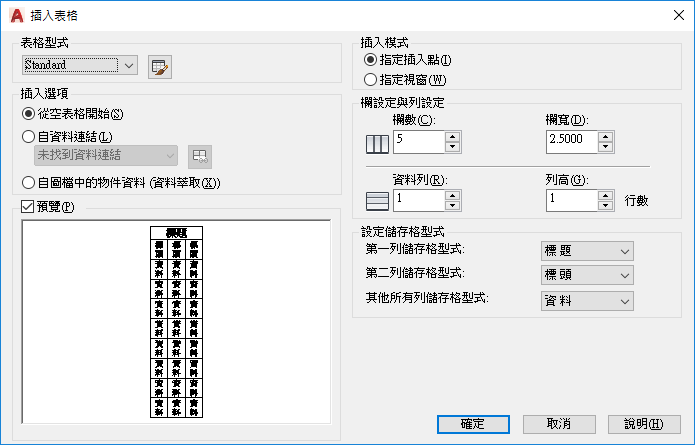 指定表格的大小與位置。您可以使用指向設備或於指令提示下輸入座標值。選取了此選項時,欄數與列數、欄寬與列高均取決於視窗的大小及欄與列的設定。