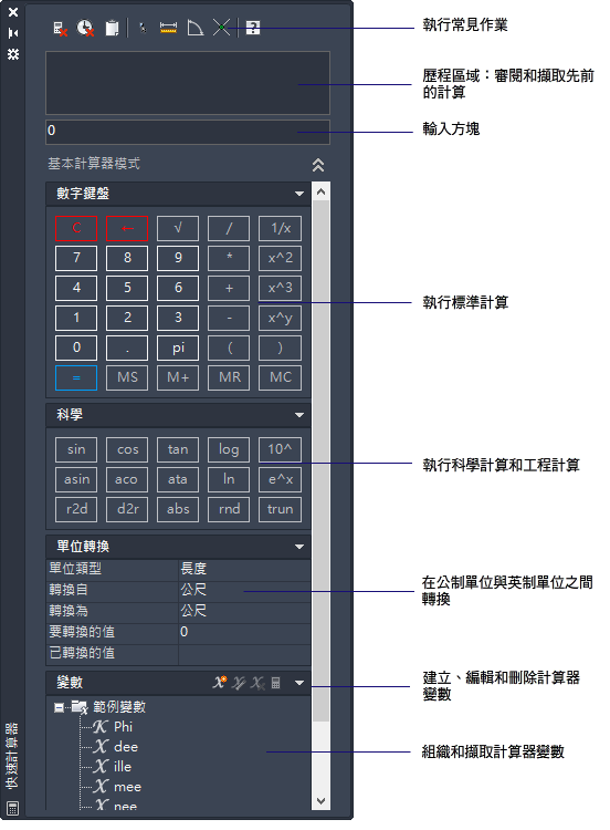 「快速計算器」除了科學計算器的基本功能之外,還包含幾何函數、單位換算和變數的功能。