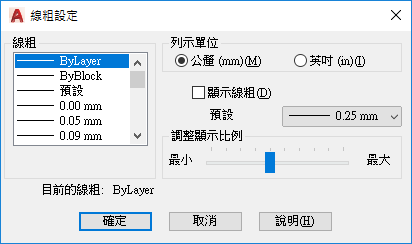 設定目前的線粗和線粗單位,控制線粗的顯示及其顯示比例,以及設定圖層的 DEFAULT 線粗值。