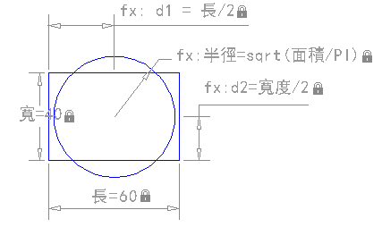 可將公式和方程式表示為尺度約束參數中的表示式,或定義使用者變數來表示公式和方程式。例如,以下插圖表示將一個圓約束至矩形的中心點,且將圓的面積約束為與該矩形相等的設計。