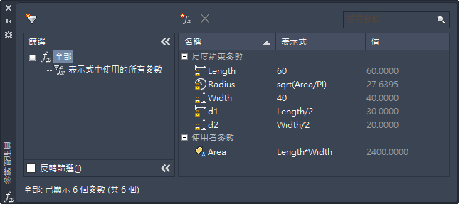Length 和 Width 尺度約束參數設定為常數。d1 和 d2 約束是參考 Length 和 Width 的簡單表示式。Radius 尺度約束參數設定為包括平方根函數、確定作業優先順序的括號、Area 使用者變數、除法運算子和常數 PI 的表示式。這些參數均在可「參數管理員」中存取。