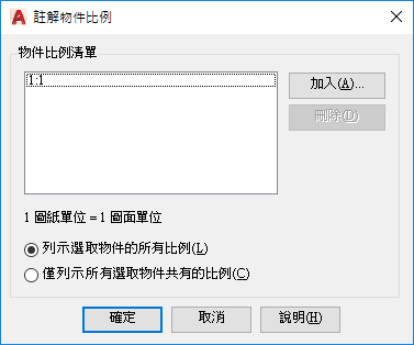 指定所選物件支援的所有比例顯示在「物件比例清單」中。