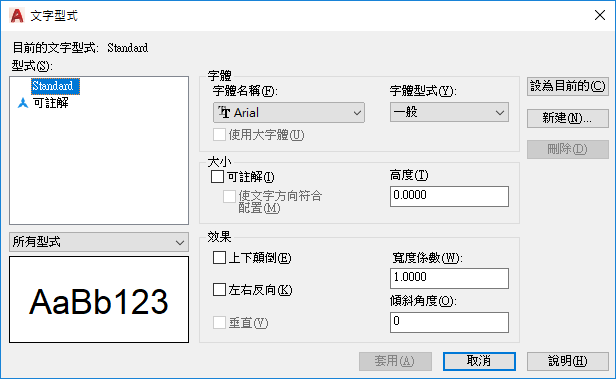 指定字體字元的格式,如斜體、粗體或標準。如果選取「使用大字體」,此選項變成「大字體」名稱,且可用來選取「大字體」檔名。