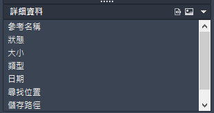 顯示「詳細資料」模式時,會報告所選檔案參考的性質。每個檔案參考都有性質的核心集,且某些檔案參考 (如參考的影像) 會顯示特定於該檔案類型的性質。詳細資料的核心集包括參考名稱、狀態、檔案大小、檔案類型、建立日期、儲存路徑,如果是已安裝 Autodesk Vault 的用戶端 (不適用於 AutoCAD LT),則可於路徑和檔案版本處取得這些資訊。可以對某些性質進行編輯。