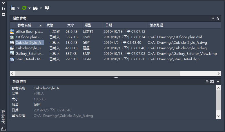 「外部參考」選項板可組織、顯示和管理參考的檔案,例如 DWG 檔 (外部參考)、DWF、DWFx、PDF 或 DGN 參考底圖、點陣式影像、點雲 (RCP 和 RCS 檔),以及座標模型 (NWD 和 NWC 檔案)。