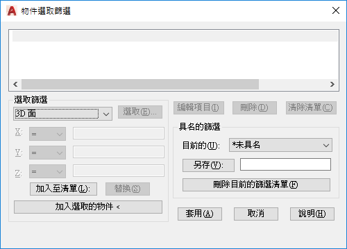 儲存篩選及其性質清單。篩選儲存在 filter.nfl 檔案中。名稱最多可有 18 個字元。