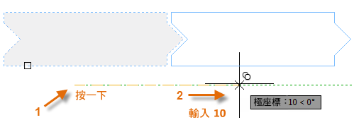 接下來,您可以將游標移至右側,藉由極座標追蹤角度保持水平方向,然後輸入 10 的距離。再按一次 Enter 或空格鍵以結束指令。