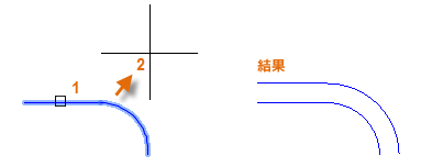 選取物件 (1),指定偏移距離,然後按一下以指定結果要產生於原始物件的哪一側 (2)。以下是偏移聚合線的範例。