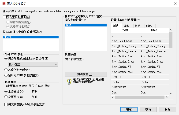 標準為預設對映設置,其從正匯出的圖面中萃取資料並將自動對映套用至 DGN 圖層、線型、線粗和顏色,如對映預覽所示。