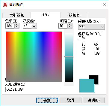 透過「色相」、「彩度」、「明度」(HSL) 顏色模型或「紅」、「綠」、「藍」(RGB) 顏色模型來指定使用全彩 (24 位元顏色) 的顏色設定。使用全彩功能時,可以使用一千六百多萬種顏色。「全彩」頁籤中的可用選項取決於指定的顏色模型 (HSL 或 RGB)。
