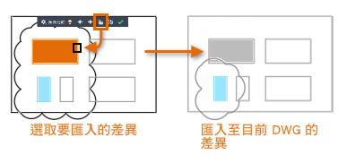 您可以從「圖面比較」工具列,將比較圖面的差異匯入至目前的圖面。您只能將比較圖面中不同的物件匯入至目前的圖面。此指令提供一種有效率的方式,能夠讓目前的圖面與舊版一致。