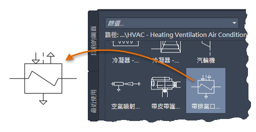 此外,按一下「目前的圖面」頁籤和「最近使用的」頁籤,來熟悉一下「圖塊」選項板。