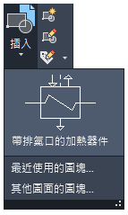 - 從「常用」頁籤按一下「插入」,然後按一下「其他圖面的圖塊」。這會啟動 BLOCKSPALETTE 指令。