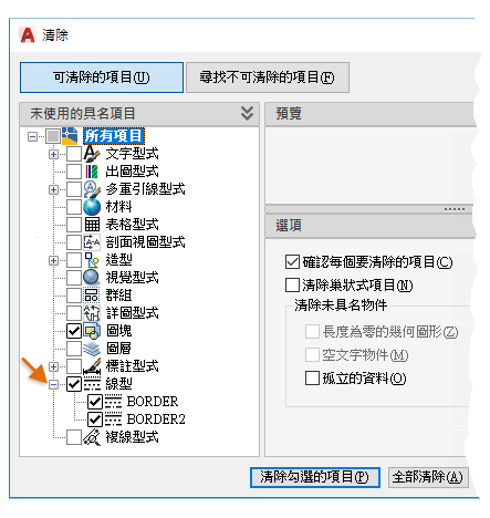 使用「清除」對話方塊可刪除未參考的定義,包括目前圖面中的線型。