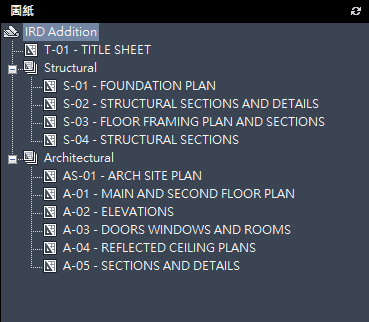 - 圖紙子集通常與某種訓練 (如建築或機械設計) 相關聯。例如,在建築上,您可以使用名為「結構」的子集;在機械設計上,可以使用名為「標準扣件」的子集。在某些情況下,您也可能會發現建立與審閱或完成狀態相關聯的子集很有用。您可以依需要將子集以巢狀方式放置在其它子集中。建立或匯入圖紙或子集後,您可以在樹狀檢視中拖曳,對其重新排序。