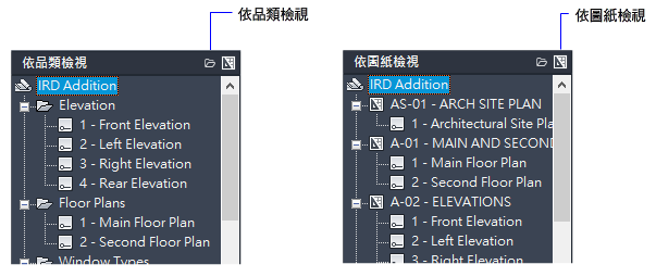 在「圖紙清單」頁籤上,可以將圖紙排列到子集集合中。在「圖紙視圖」頁籤上,可以將視圖排列到品類集合中。