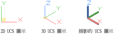 在 2D 環境中工作時,您可以選擇 2D 或 3D 圖示型式來表示 UCS。