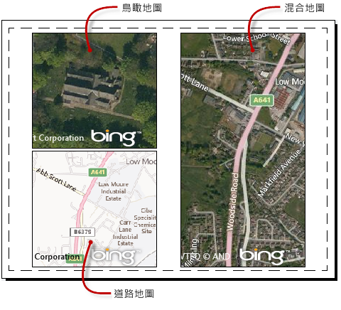 您可以將地圖顯示為衛星影像 (鳥瞰型式地圖) 或向量影像 (道路型式地圖)。您也可以將地圖顯示為混合鳥瞰和道路的型式。如果繪圖區分為多個視埠,則每個視埠均可具有不同型式的地圖。