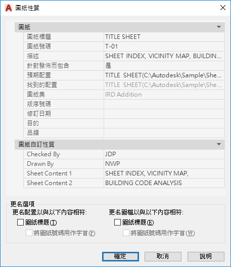 顯示所選圖紙所特有的資訊,例如,圖紙標題、圖紙號碼,以及是否包括在發佈作業中。還顯示自訂性質 (如果有)。