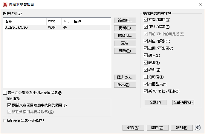 在圖層狀態已儲存後所建立的圖層會處於關閉狀態。此設定的目的是保留儲存圖層狀態當時的圖面視覺外觀。