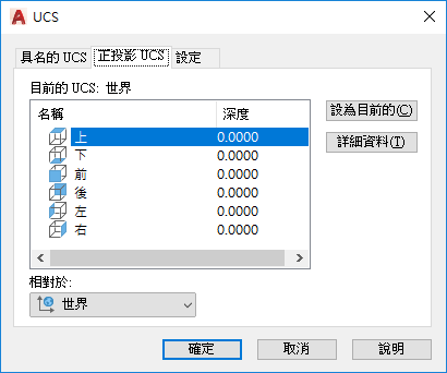 列示目前圖面中定義的六個正投影座標系統。正投影座標系統是根據「相對於」清單中所指定的 UCS 定義的。