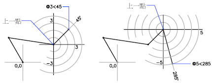 建立物件時,可以使用絕對或相對極座標 (距離與角度) 來定位點。