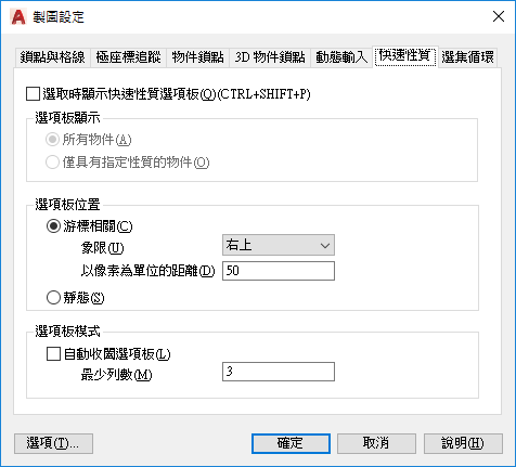設定快速性質選項板的顯示設定。請參閱「自訂快速性質」的更多資訊。