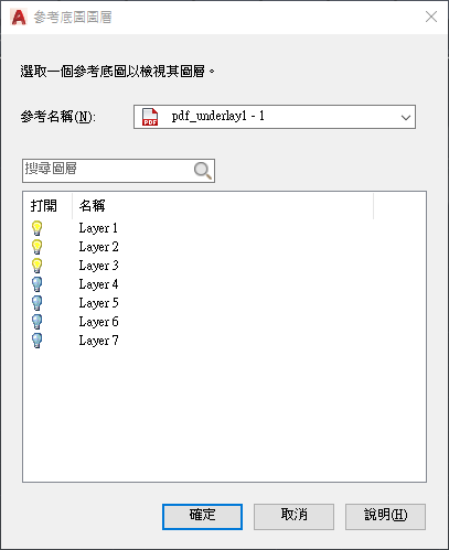 使用 DWFLAYERS、PDFLAYERS、DGNLAYERS 或 ULAYERS 指令或在選取的參考底圖上按一下滑鼠右鍵,並於快顯功能表上按一下圖層。