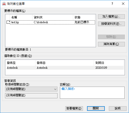 將數位簽章貼附至此對話方塊中列示的每一個檔案。
