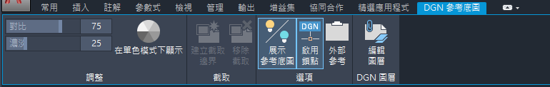 選取圖面中的 DGN 參考底圖時,功能區上會顯示「DGN 參考底圖」關聯式頁籤。