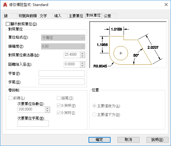 指定標註測量結果中對照單位的顯示,並設定對照單位的格式與精確度。