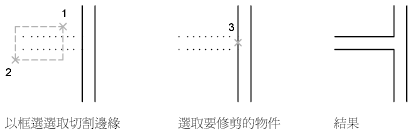 修剪數個物件時,使用不同的選取方式可以協助您選擇目前要修剪的切割邊與物件。在下列範例中,切割邊是透過框選選取的。