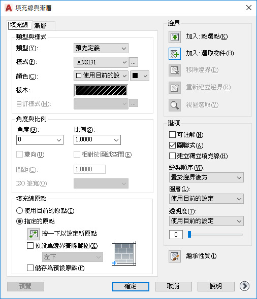 「填充線與漸層」對話方塊具有兩個頁籤,您可從這兩個頁籤中使用一些常用的選項。