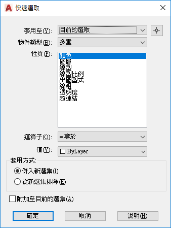 如果已選取「附加至目前的選集」,篩選條件便會套用到整個圖面。