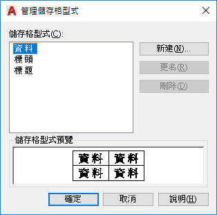 顯示目前表格型式中的所有儲存格型式,並可讓您建立和刪除儲存格型式。