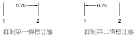 抑制標註線的顯示。「標註線 1」抑制第一條標註線,「標註線 2」抑制第二條標註線。(系統變數 DIMSD1 與 DIMSD2)