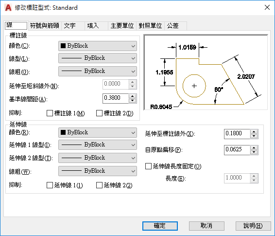 設定標註線、延伸線、箭頭和中心標記的格式和性質。