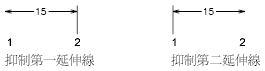抑制延伸線的顯示。「延伸線 1」抑制第一條延伸線,「延伸線 2」抑制第二條延伸線。(系統變數 DIMSE1 與 DIMSE2)