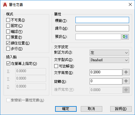 設定屬性文字的對正方式、型式、高度以及旋轉角度。
