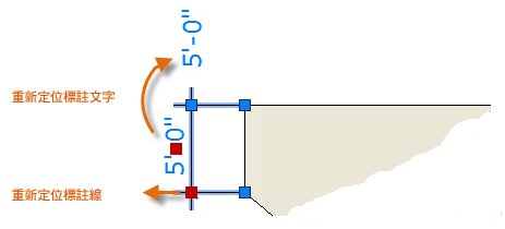 在此範例中,您可以選取標註以顯示其掣點。接下來,按一下標註文字上的掣點並將其拖曳至新位置,或者按一下標註線端上的其中一個掣點,然後拖曳標註線。