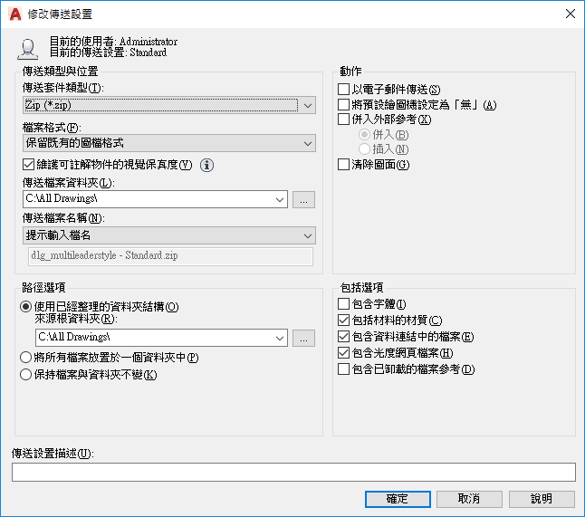 指定檔案格式,傳送套件中包括的所有圖面將被轉換為此種檔案格式。您可以從下拉式清單中選取圖檔格式。