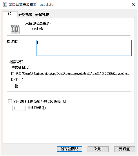 在此出圖型式表所控制的物件出圖型式中,調整全部的非 ISO 線型及填滿樣式。