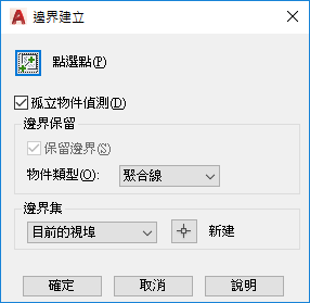 控制新邊界物件的類型。BOUNDARY 會將此邊界建立為面域或聚合線物件。