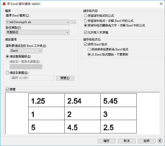 可將 Excel 檔內整個指定的工作表連結至圖面中的表格。