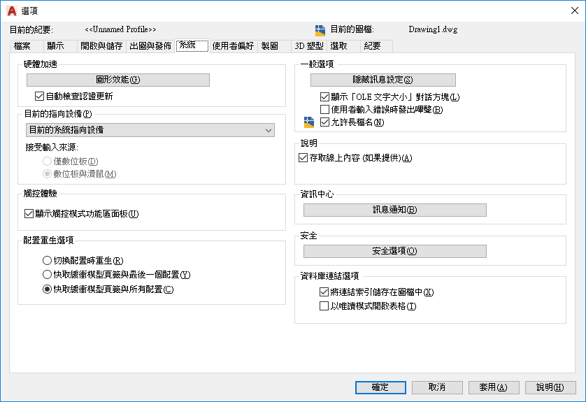 在每個頁籤中,顯示清單的更新方式一定是下列兩種方式之一:即切換至某頁籤時重生圖面,或先將顯示清單儲存至記憶體中,然後在切換至該頁籤時僅重生已修改的物件。變更這些設定可增進效能。(系統變數 LAYOUTREGENCTL)