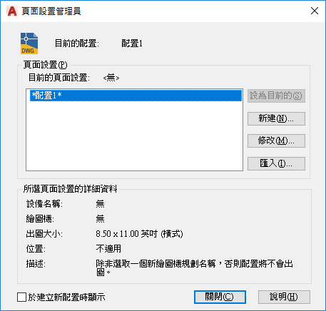 從「圖紙集管理員」開啟「頁面設置管理員」時會顯示。