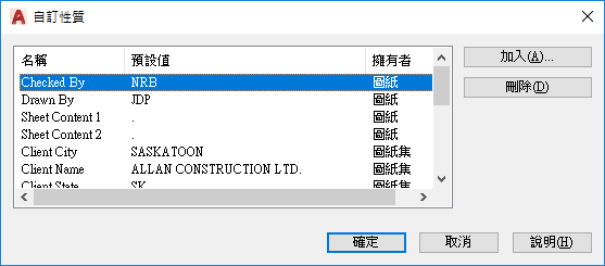 SHEETSET (指令) 查找:在圖紙集名稱上按一下右鍵 > 「性質」 > 「編輯自訂性質」