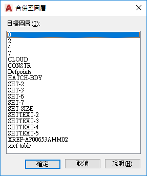 顯示依字母順序列示的圖層清單,所選圖層或物件可在這些圖層上合併。