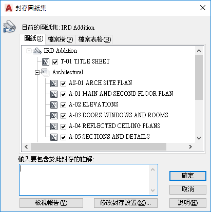 「圖紙」頁籤將按照圖紙順序並根據子集組織,列示封存套件中要包括的圖紙。「檔案樹」頁籤將以階層式樹狀格式,列示套件中要包括的檔案。「檔案表格」頁籤將以表格格式,顯示套件中要包括的檔案。