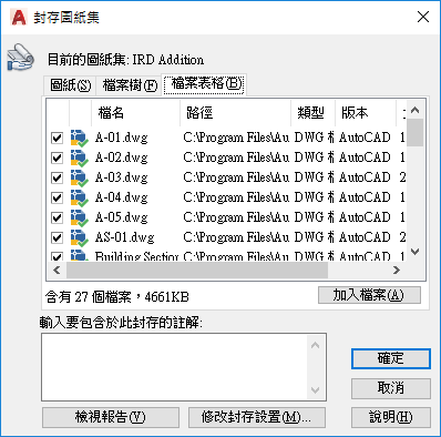使用表格格式顯示要併入封存套件中的檔案。依預設,目前圖面的所有相關檔案 (如相關的外部參考、出圖型式和字體) 都會列出。您可以將檔案加入封存套件,也可以移除既有的檔案。URL 所參考的相關檔案不會併入封存套件。